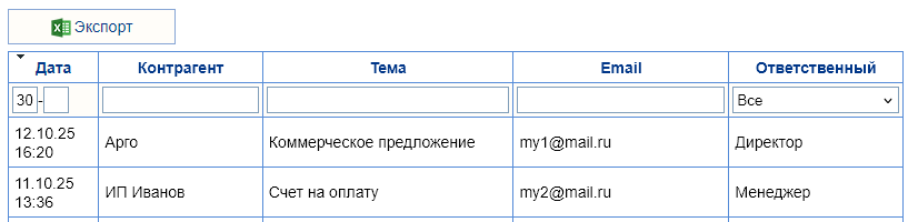 Модуль сохраняет логи всех email, отправленных из СКИФ и отображает их в виде журнала с фильтрами. Будет полезен для анализа работы менеджеров или истории взаимоотношений с клиентами.