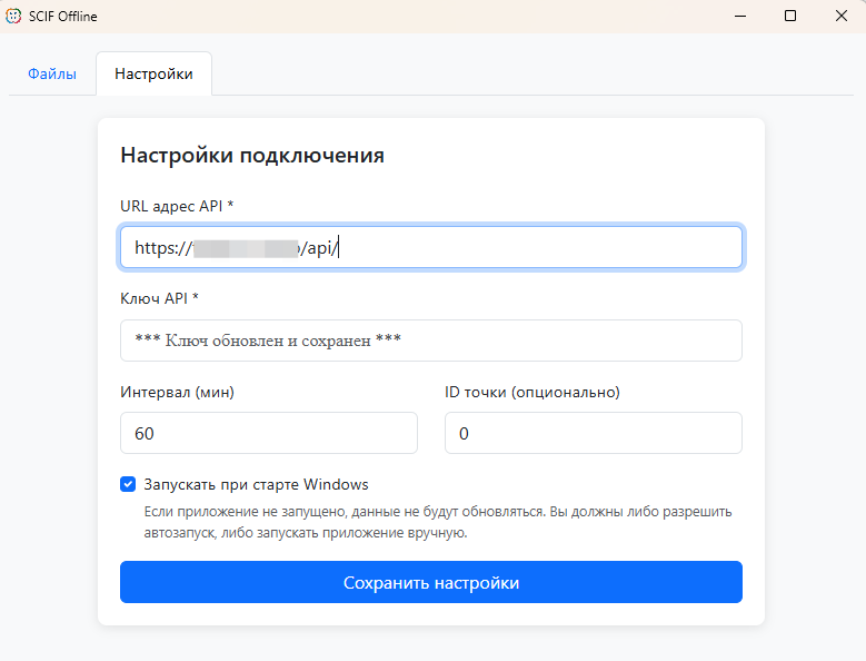 Программа портативная, т.е. не требующая установки и прав администратора, нужно просто распаковать её в отдельную папку на своем компьютере и сделать настройки: внести адрес своего сервера, токен доступа и задать интервал синхронизации.